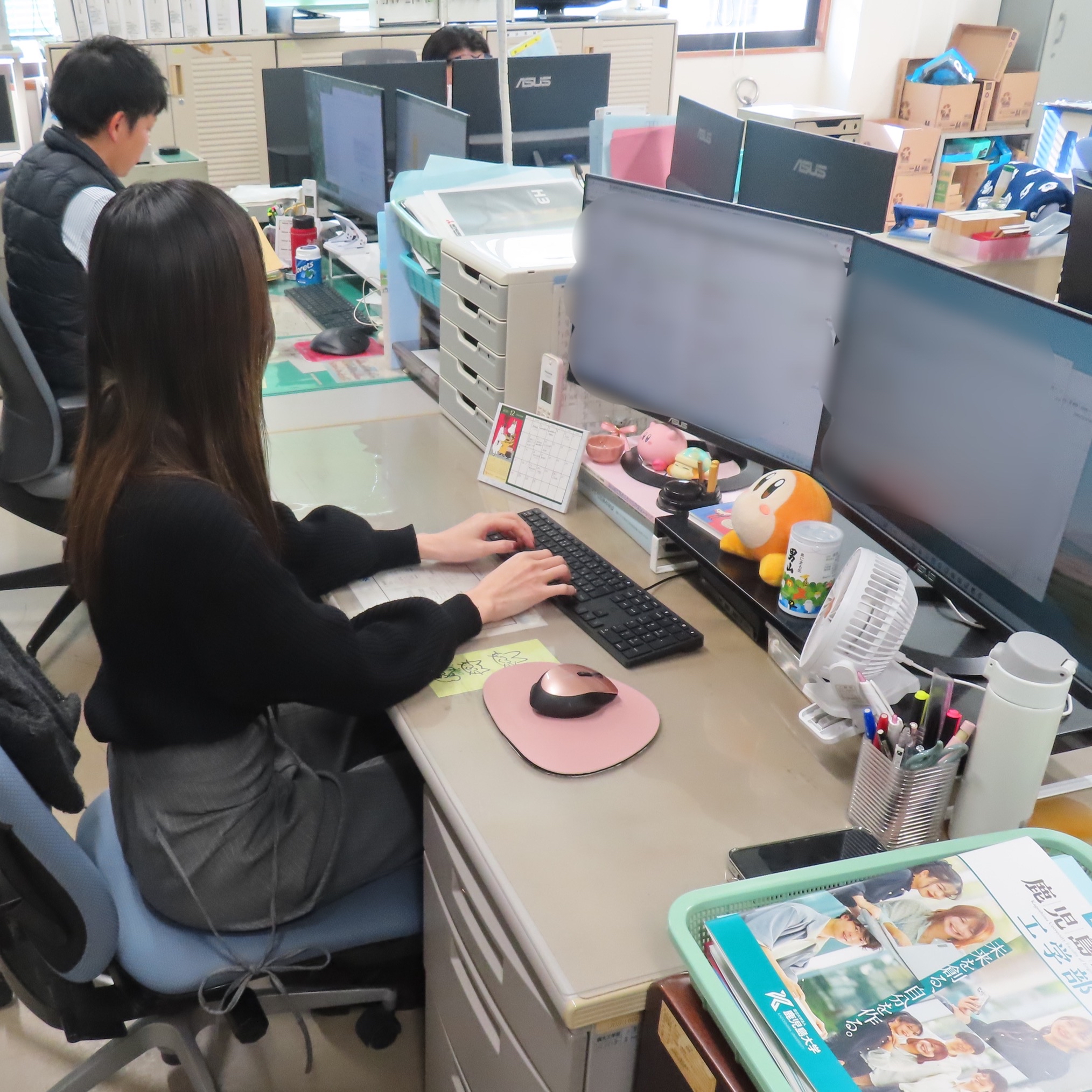 工学部内における職員の採用業務をはじめ、教職員の勤務時間管理や安全衛生に関する事務を担当しています。また、放射線障害防止に関わる手続きや国際交流に関する企画・調整のほか、定期的な職場巡視にも携わっています。幅広い業務を通して組織全体の運営を支える役割を実感しながら、日々学びを深めています。