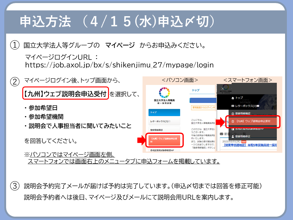マイページの 「【九州】ウェブ説明会申込受付 」 からお申込みください。お申込みいただいた方へは後日説明会のURLをお知らせします。